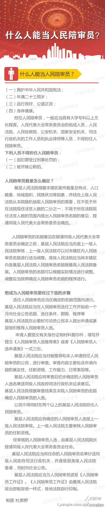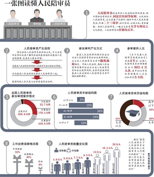 党的十八届四中全会《决定》指出,完善人民陪审员制度,保障公民陪审权利,扩大参审范围,完善随机抽选方式,提高人民陪审制度公信度。观看图片,了解人民陪审员制度。