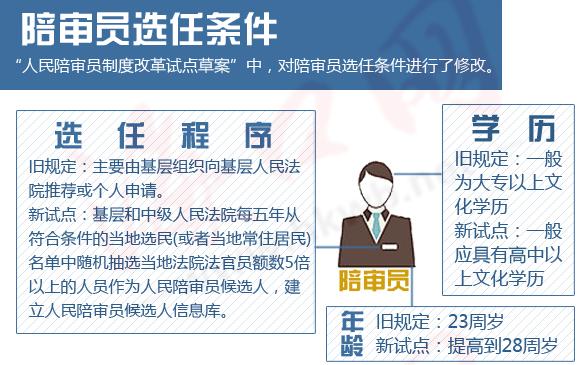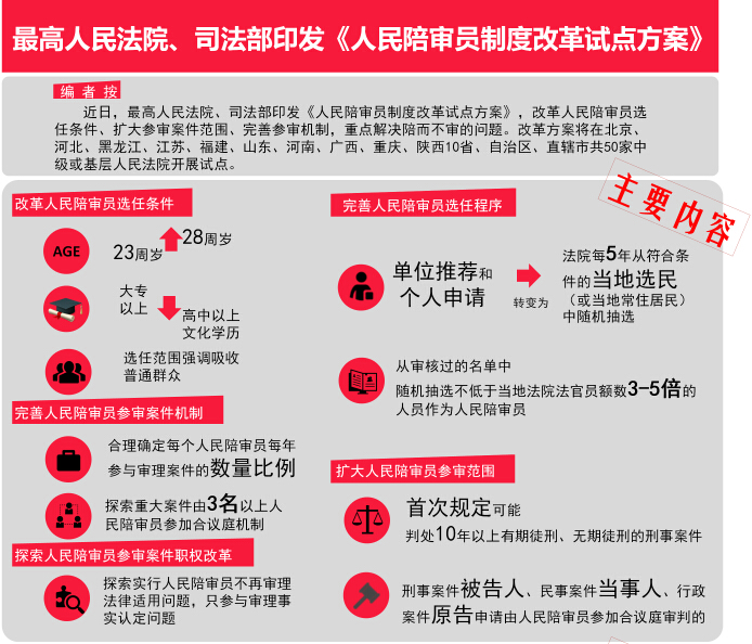 2015年4月24日,十二届全国人大常委会第十四次会议作出授权在部分地区开展人民陪审员制度改革试点工作的决定。选择北京、河北、黑龙江、江苏、福建、山东、河南、广西、重庆、陕西10省(区、市),每个省(区、市)选择5个法院开展人民陪审员制度改革试点工作。试点期限为二年,自试点办法印发之日起算。